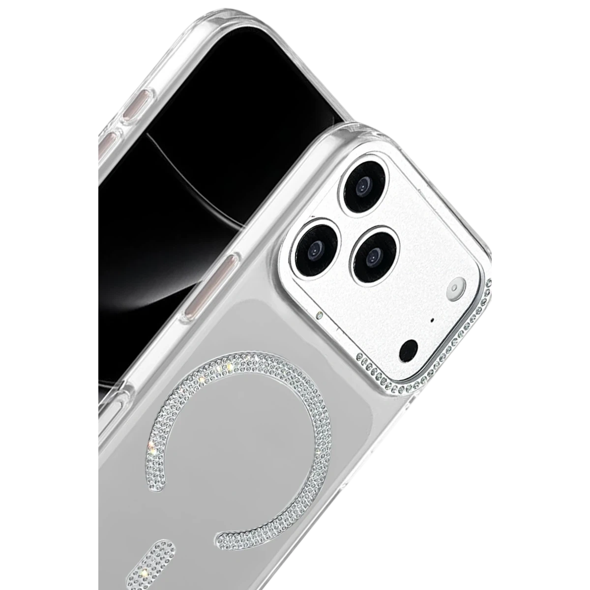 Parlak kristal taşlarla süslenmiş MagSafe halkası; manyetik şarj cihazları, standlar ve MagSafe aksesuarlarla güçlü ve stabil bir uyum sunar.